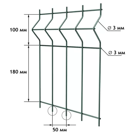 3D-забор — это секционное ограждение, где к опорным столбам крепится сварная сетка, на полотне которой есть V-образные выступы. Такие выступы работают как ребра жесткости, повышая прочность полотна в условиях статических и динамических нагрузок.